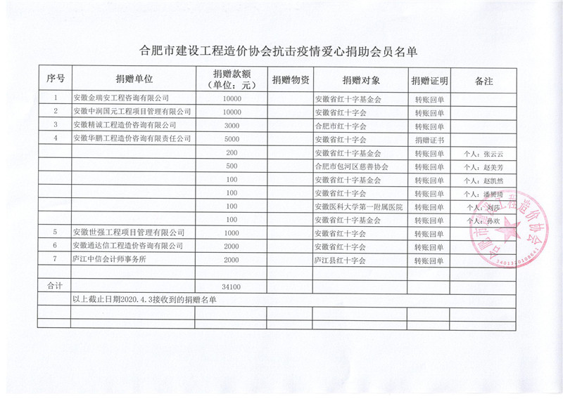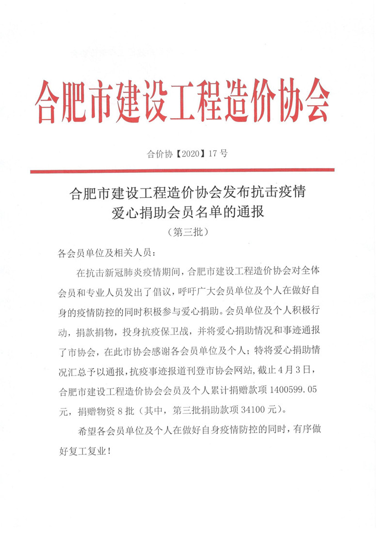 合肥市建设工程造价协会发布抗击疫情爱心捐助会员名单的通报(第三批)