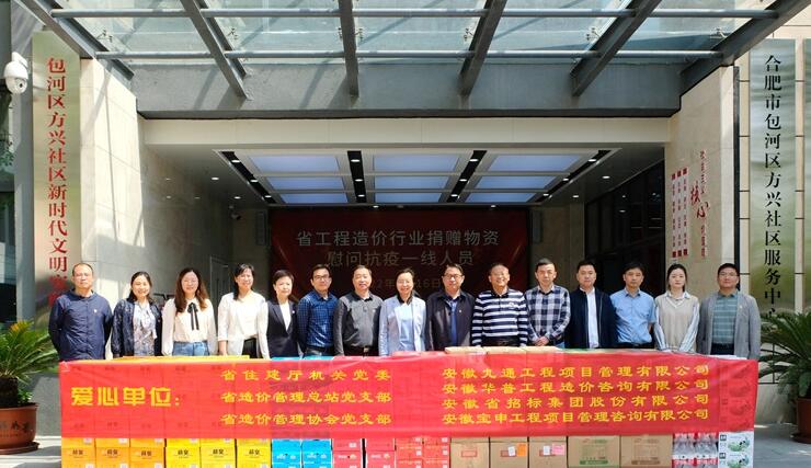 5月16日上午,省住建厅机关党委、省造价管理总站牵头,省造价管理协会组织安徽九通工程项目管理有限公司、安徽华普工程造价咨询有限公司、安徽省招标集团股份有限公司、安徽宝申工程项目管理咨询有限公司等四家企业赴方兴社区服务中心,向其捐赠一批生活物资共180箱,助力疫情防控,慰问抗疫一线工作人员。