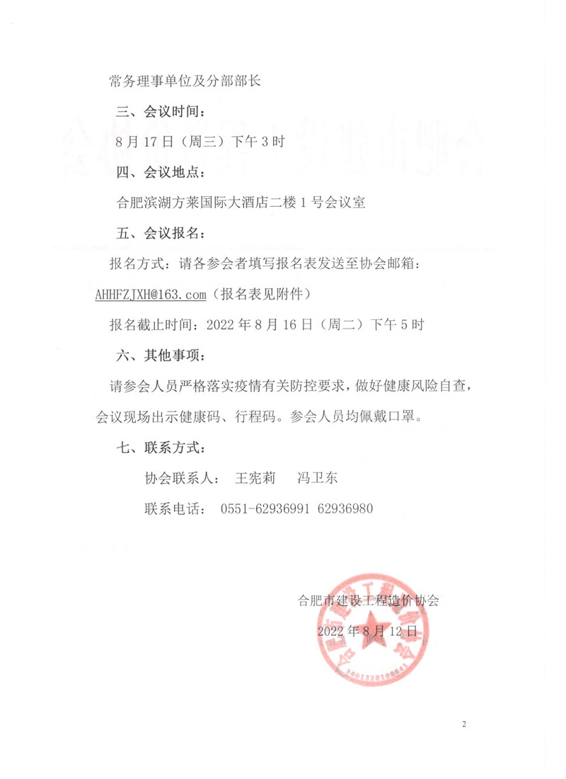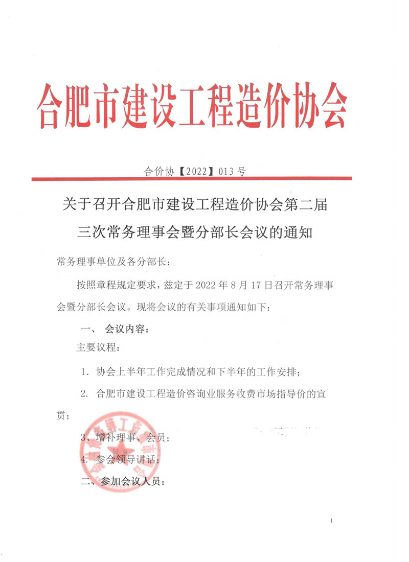 关于召开合肥市建设工程造价协会第二届三次常务理事会暨分部长会议的通知