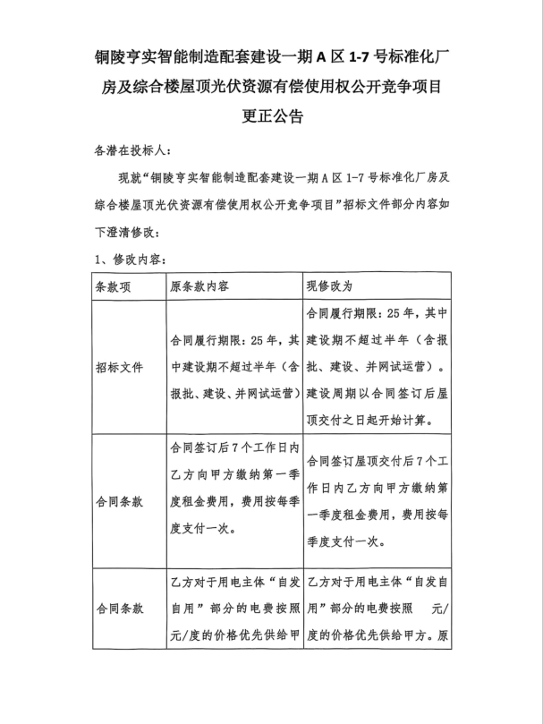 铜陵亨实智能制造配套建设一期A区1-7号标准化厂房及综合楼屋顶光伏资源有偿使用权公开竞争项目更正公告